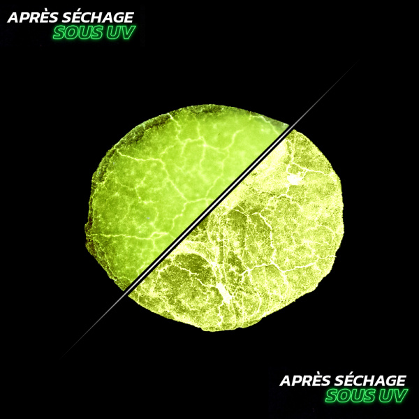 • Visibility under UV lamp after drying (several weeks): Fluorescent yellow under a 365 nm UV lamp from the Fluotechnik range.