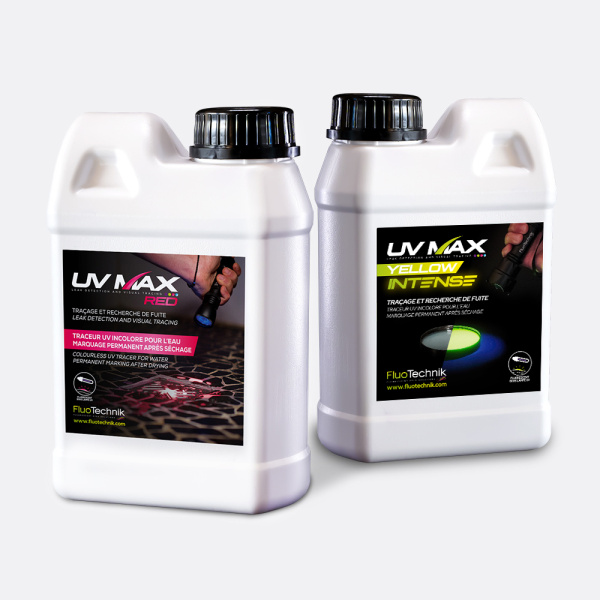 Ultra-concentration: UV MAX is an extremely concentrated tracer, requiring only a dosage of 2 to 10 ml per liter in most situations. Paired with UV lamps from the FLUOTECHNIK range, it offers a powerful luminescent contrast, perfect for revealing leaks and micro-leaks before and after drying.