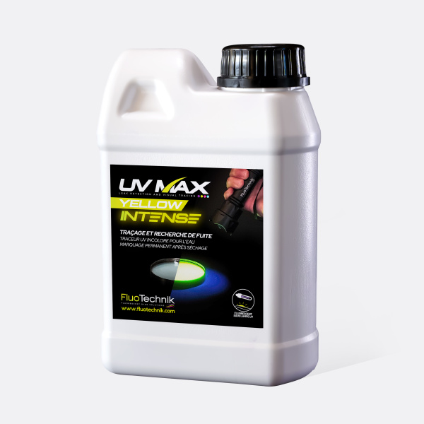 UV MAX YELLOW INTENSE is a new generation ultra-concentrated tracer! With an optimized dosage between 2ml and 10ml/L, it is even more effective in a wide variety of situations. Combined with the UV lamps from the FLUOTECHNIK range, UV MAX YELLOW INTENSE offers an exceptionally powerful and visible luminescent contrast, making it an unparalleled revealer of leaks, micro-leaks, and capillary rises. Usable in addition to the UV MAX range, it is ideal for multi-tracing.
